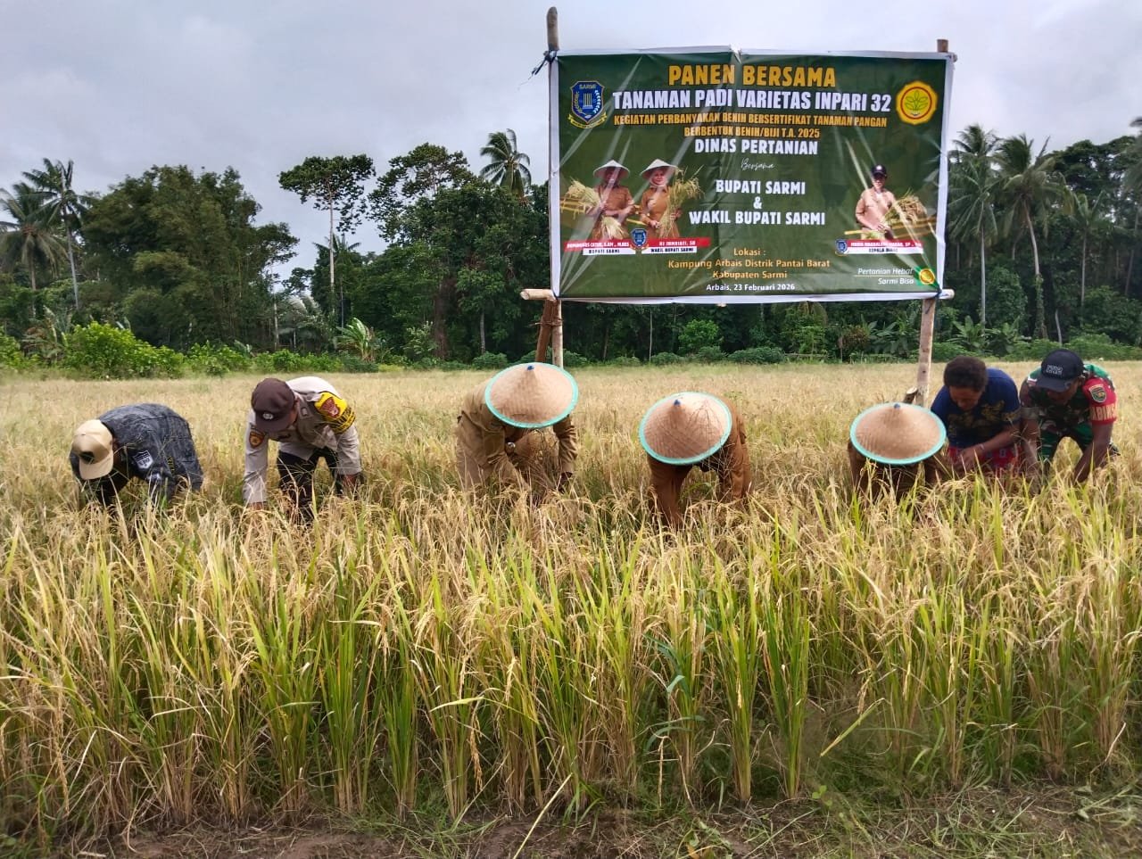 Sarmi – Personel Polsek Pantai Barat menghadiri kegiatan panen raya padi yang dilaksanakan di Kampung Arbais, Distrik Pantai Barat, Kabupaten Sarmi, pada Senin (23/2/2026).