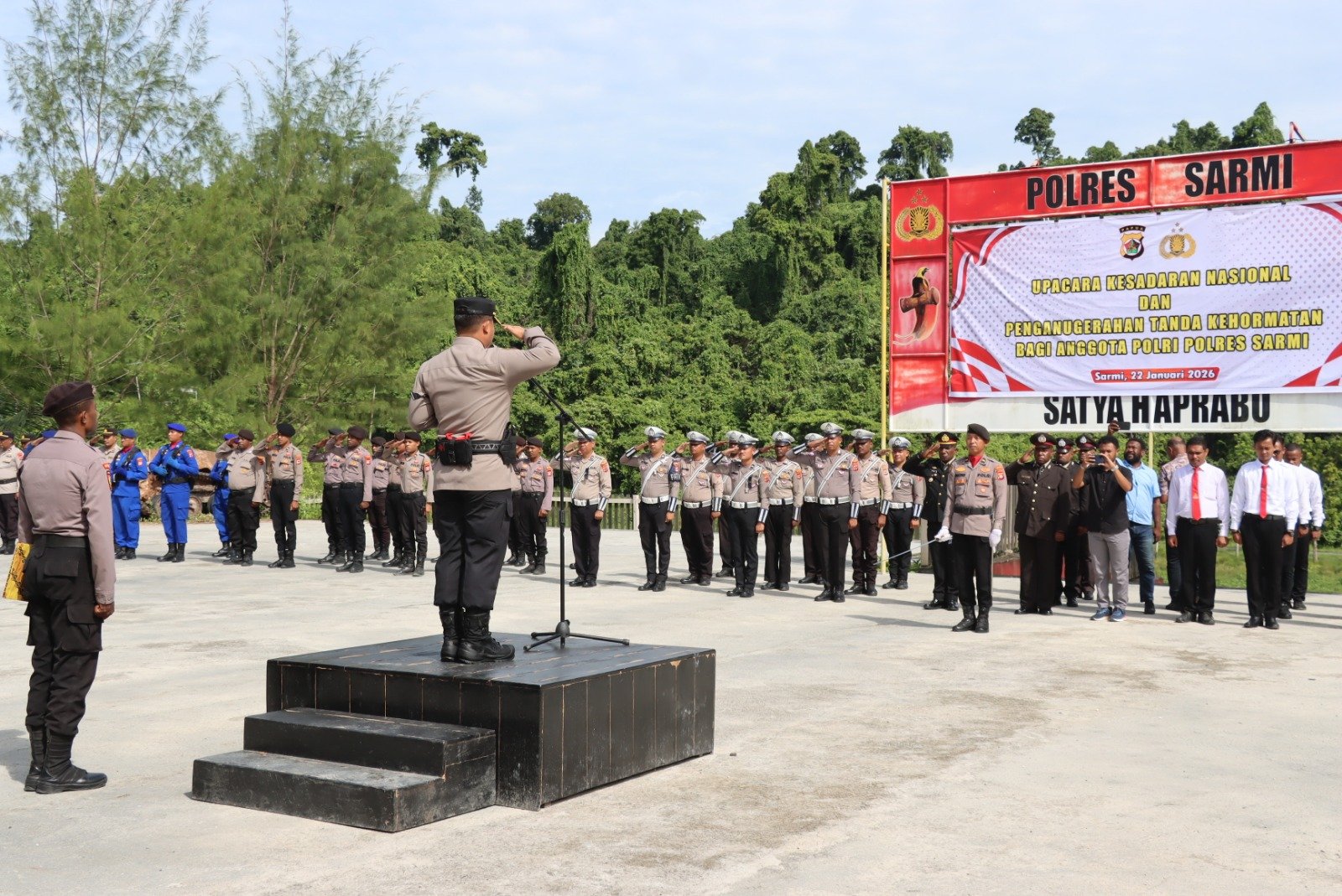 Sarmi – Kepolisian Resor Sarmi melaksanakan Upacara Kesadaran Nasional yang dirangkaikan dengan Penganugerahan Tanda Kehormatan Satyalancana Pengabdian kepada anggota Polri, bertempat di lapangan apel Polres Sarmi, Kamis (22/01/2026).