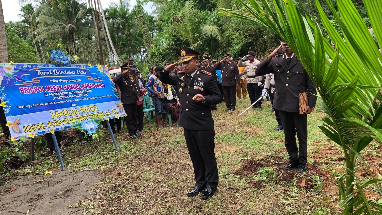 Sarmi – Jajaran Polres Sarmi bersama Bhayangkari Cabang Sarmi turut menghadiri dan melaksanakan upacara pemakaman almarhum Brigpol Mesak S. Baransano, personel Ba Polsubsektor Pulau Liki, yang meninggal dunia akibat sakit. Upacara dilaksanakan di rumah duka Kampung Armopa, Distrik Bonggo, Kabupaten Sarmi. Senin (10/11/2025)