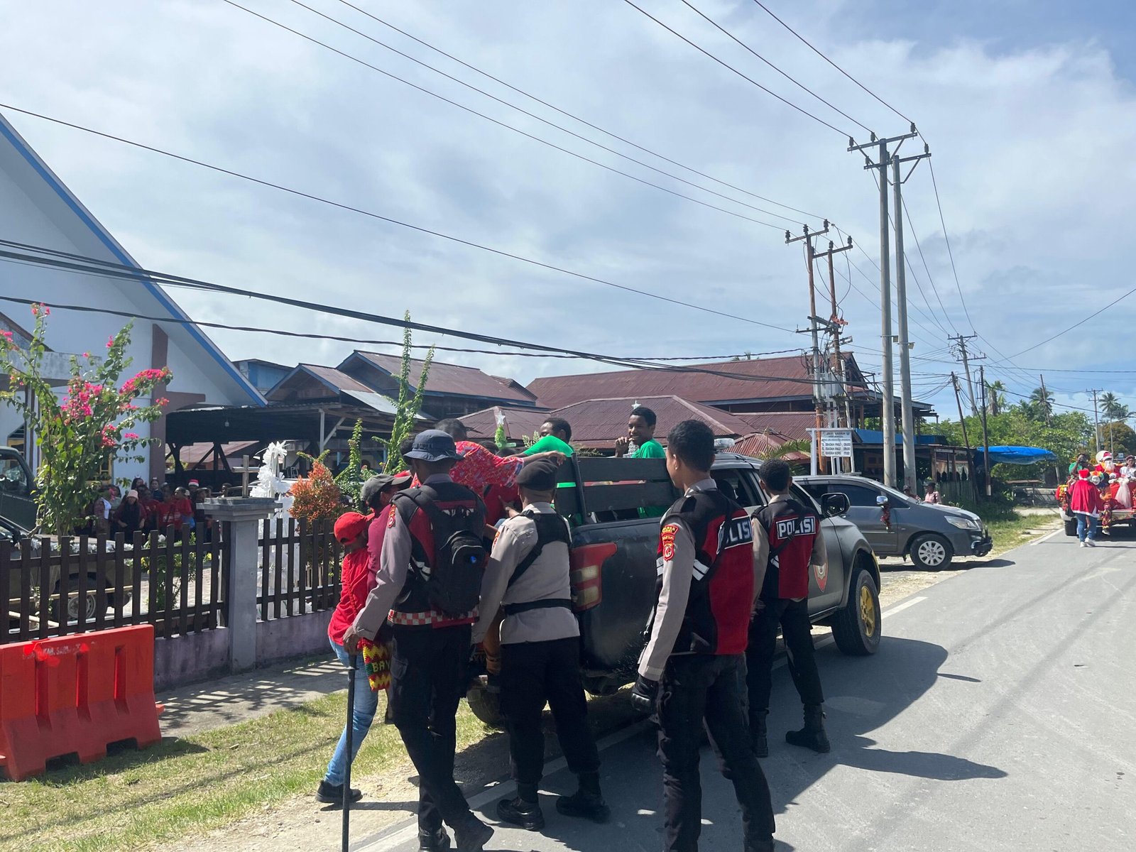 Sarmi – Dalam rangka menyambut perayaan Natal, Polres Sarmi melalui personil Pos Selter Sat Samapta dan Satuan Lalu Lintas Polres Sarmi melaksanakan pengamanan dan pengawalan Pawai Santa Claus GKI Maranatha pada Sabtu, 06 Desember 2025. Kegiatan yang dipimpin oleh IPDA Antonius A. Hubi ini menarik perhatian masyarakat karena menghadirkan suasana sukacita serta semangat kebersamaan di Kota Sarmi.