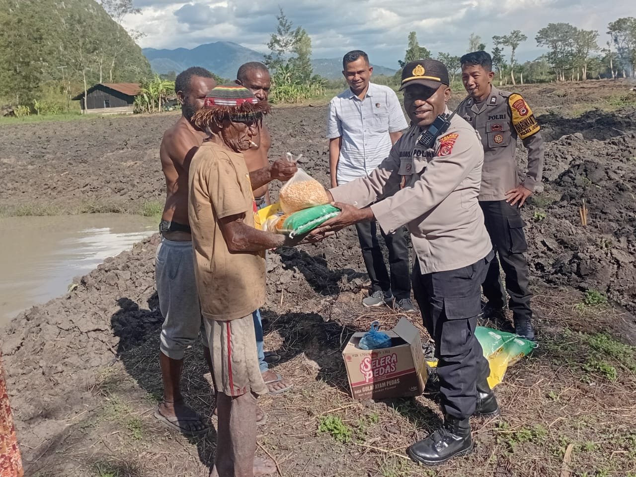 Dipimpin oleh Kapolsek Kurulu AKP Yulianus Giay, SH, didampingi Kanit Binmas Aiptu Heru Winarto dan Bhabinkamtibmas Bripka Ida Bagus Susanta, tim Polsek menyerahkan bantuan berupa beras, gula, kopi, pinang, dan rokok kepada Kepala Kampung, Yance W, yang diterima langsung bersama masyarakat.